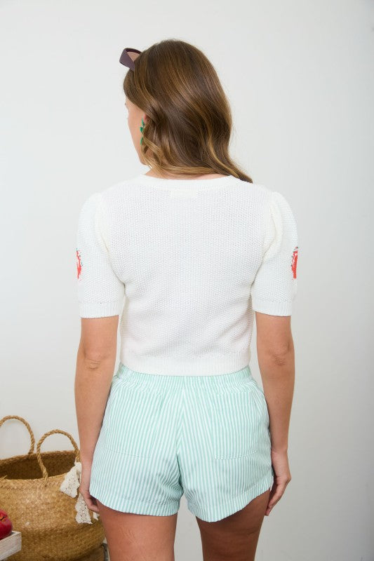 Brighten your wardrobe with this adorable Tomato Cardigan, featuring a cheerful vegetable jacquard pattern that brings garden-fresh style to your everyday look. Cut short and cropped for a modern silhouette, this button-down knit sweater boasts a classic round neckline and short sleeves perfect for layering. Crafted from a cozy cotton and acrylic blend, it's soft, breathable, and easy to care for. Whether you're channeling retro vibes or adding a whimsical touch to casual outfits, this playful piece is sure to turn heads and spark conversations.